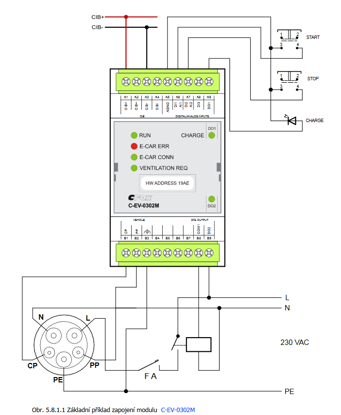 The power supply of the module is from the CIB bus. The CIB Comon Installation Bus® can have any topology and branching up to a distance of 500 m and up to 32 units on one CIB branch. The maximum consumption of all modules in one CIB branch is limited to 1A. The device contains a bus according to the IEC 61851-1 standard for controlling the AC charging of electric vehicles. DO1 is used to connect the charging indicator diode. The diode is connected to DO1 directly without resistance. This LED indicates that the electric car is charging. The E-CAR ERR LED indicates an error on the bus for charging electric cars, or a disconnected electric car during charging. The E-CAR CONN LED indicates the connection of the electric car. The VENTILATION REQ LED indicates space ventilation request during charging. The CHARGE LED indicates that the electric car is charging. |