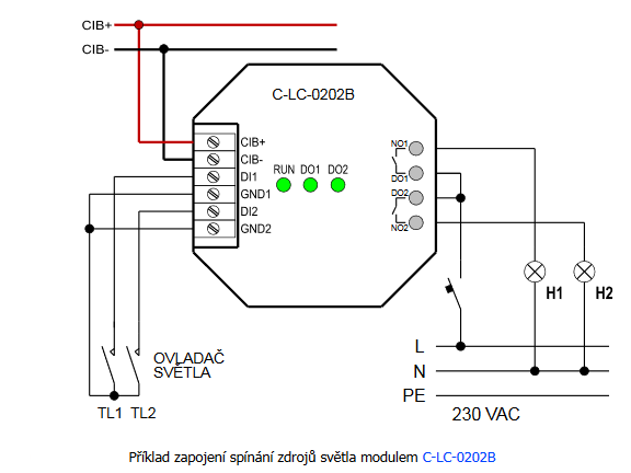 Modul C-LC-0202B má sběrnici CIB a 2 vstupy vyvedeny na šroubové svorkovnice, spínací kontakty relé jsou vyvedeny pomocí izolovaných vodičů délky cca 80 mm zakončených dutinkami. Další informace jsou v příručce Periferní moduly na sběrnici CIB TXV 004 13. Příklad zapojení modulu je zobrazen na obrázku. |