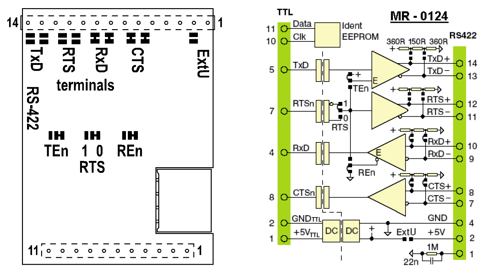 - MR-0124 - rozhraní RS-422, s galvanickým oddělením - Submodul MR-0124 zajišťuje převod signálů TTL sériového rozhraní na rozhraní RS-422 galvanicky odděleném. Rozhraní umožňuje spojení dvou spolupracujících zařízení (bod-bod). Každé jednotlivé vedení (RxD i TxD) musí být zakončeno na konci ve...