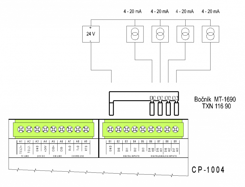 • Analogové vstupy CP-1004, měření proudu 0 ÷ 20 mA - ...orná na GND). Proudové vstupy vyžadují externí bočník 500 Ω, který lze realizovat samostatně objednatelným bočníkem MT-1690 (viz obr. 1). Vývody bočníku MT-1690 se zasunou přímo do svorek spolu s připojovacími vodiči. Nevyužívané vývody...
