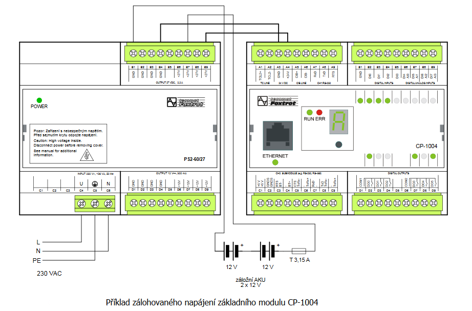 • Externí CIB master CF-1141 - ...z výstupu BACKUP (svorky B8 a B9) napájet i základní modul, ale pouze v případě, že celkový příkon sestavy vyhovuje zdroji PS2-60/27 .  Nebo je možno napájet i zálohovat modul CF-1141 i základní modul Foxtrot (např. CP-1000 ) samostatně a...