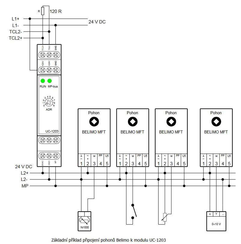 Popis Připojení Belimo pohonů k modulu UC-1203 se provádí pomocí svorek 24V~/GD/MP. Modul UC-1203 neposkytuje pro ovládané pohony napájení, pohony musí být napájeny externím napaječem (napaječi) 24V AC/DC.